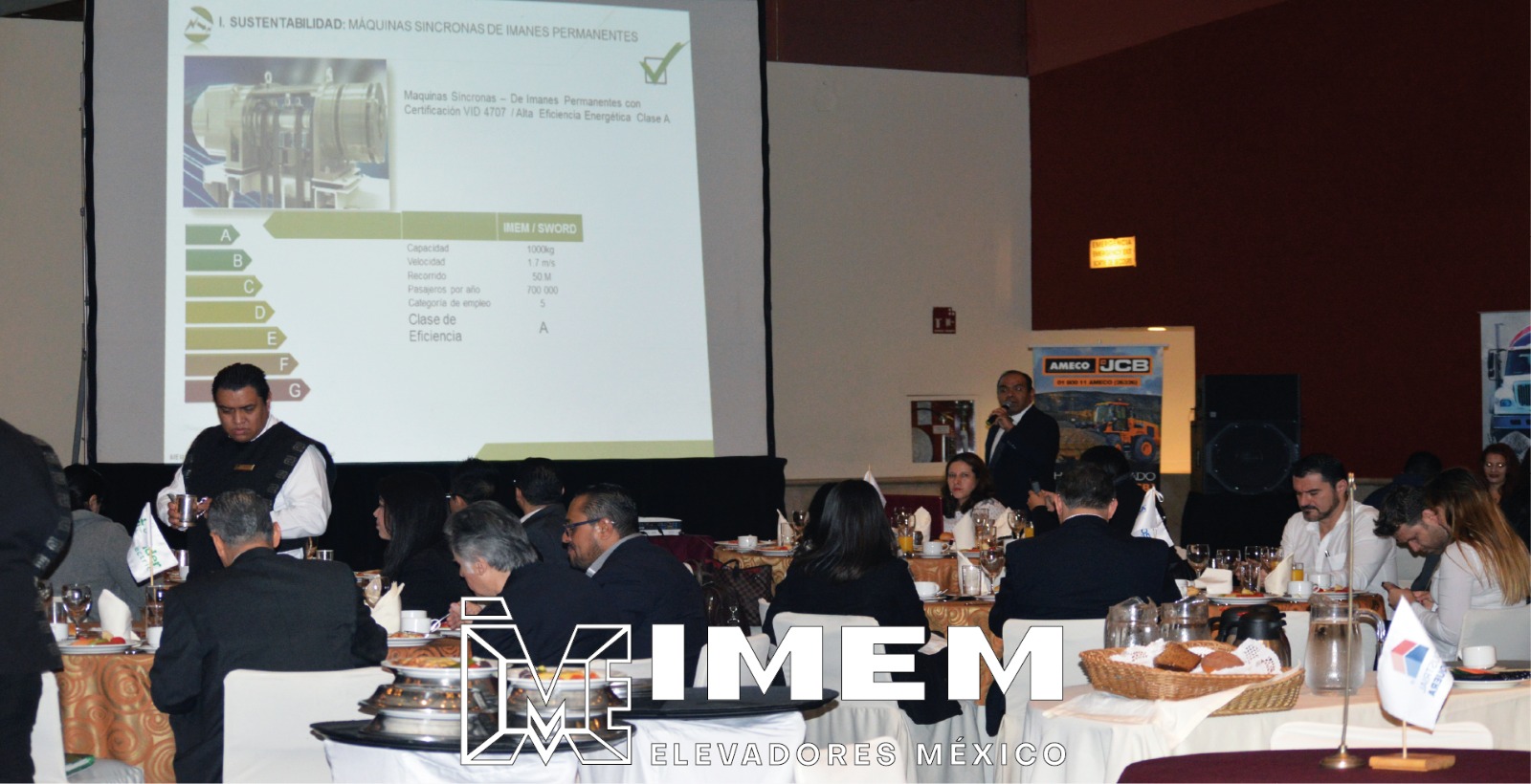 Resaltando dentro de esta presentación , la introducción en IMEM de Bandas Tractoras en los Elevadores, teniendo estas de dos a tres veces una vida útil mayor , comparado con el cable tractor convencional , de igual forma IMEM introducimos el DRIVE REGERATIVO que produce Energía limpia , así como las certificaciones VID CLASE A , de alta eficiencia energética , para nuestras maquinas tractoras de imanes permanentes.
